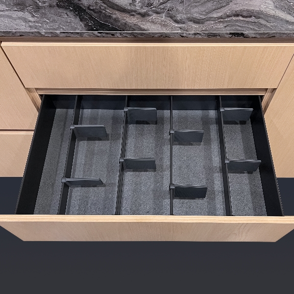 Высокопрочные перегородки + конструкция с защелками позволяют гибко регулировать размеры отделений для размещения бутылок, посуды и приправ. От миниатюрных баночек для соусов до высоких бутылок с маслом — все найдет свое точное место.