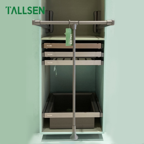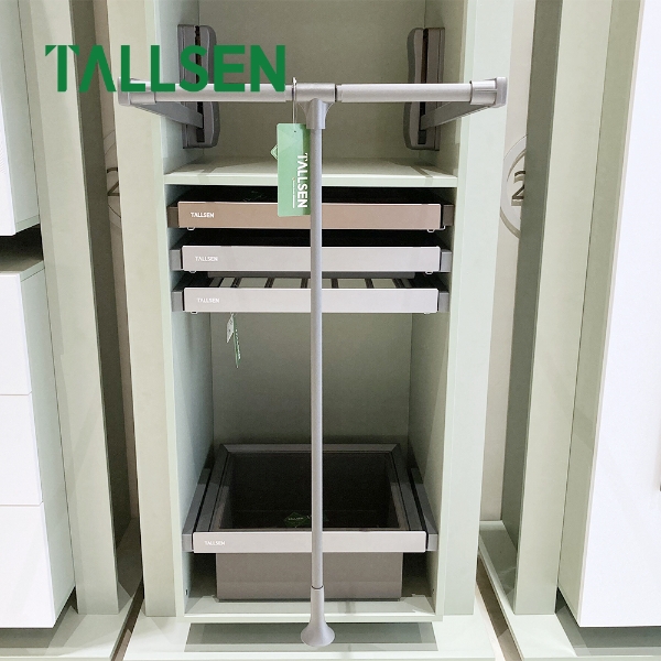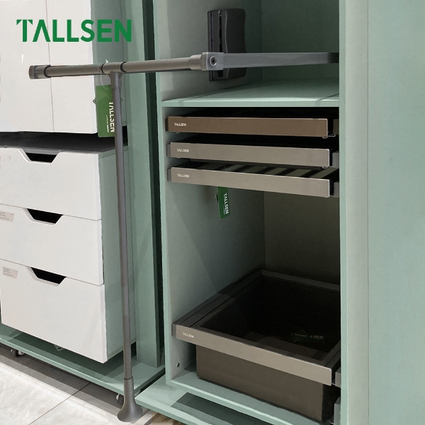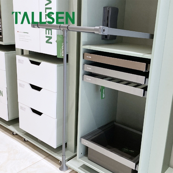 Перекладина имеет телескопическую и регулируемую конструкцию, что делает подвес подходящим для шкафов различной ширины. Соединительные элементы подвеса изготовлены из пластики, что обеспечивает устойчивость к коррозии и плотное соединение, предотвращая тряску и падение. Подвес оснащен демпфером, который предотвращает резкое падение скорости, обеспечивает плавное возвращение и автоматическое поднятие при легком нажатии, делая использование более практичным и удобным. Подвес позволяет максимально использовать верхнюю часть гардеробной, расширяя пространство для хранения. Это делает его практичным решением для организации гардеробной.