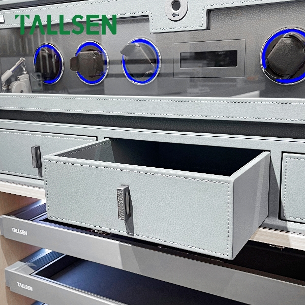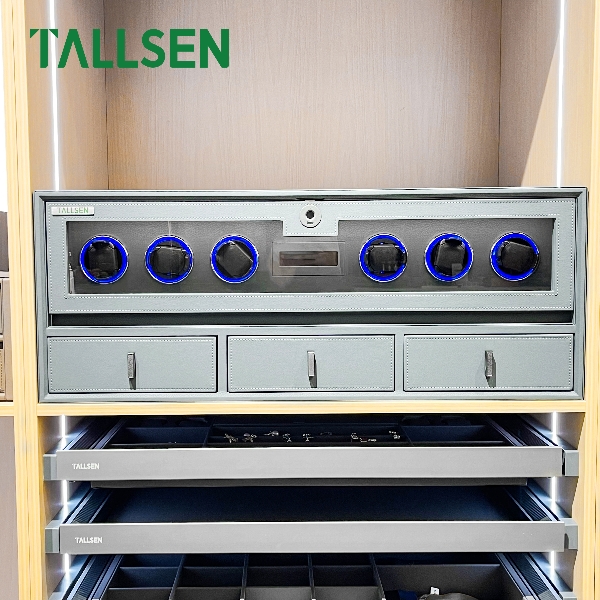 Ящик для хранения вещей TALLSEN Серия галактический серый SH8194, изготовленный из высокоплотной доски и микрофибры, отличается прочной конструкцией и изысканной текстурой. Оснащен автоматическим устройством для завода часов, обеспечивающим точное обслуживание часов, и надежным ящиком с кодовым замком для хранения ценных вещей. Его научно продуманная конструкция с зонированием гармонично сочетает в себе практическую функциональность и изысканную эстетику, представляя собой качественный выбор для идеального образа жизни.