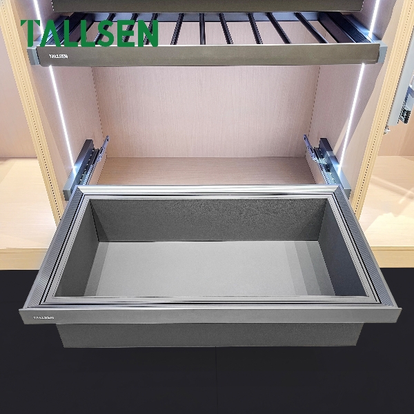 Шкаф для хранения TALLSEN cерия галактический серый — SH8127 Кожаный ящик для хранения. Изготовлен из магниево-алюминиевого сплава в сочетании с кожей, его изысканная текстура подчеркивает высокое качество. Обладая большой вместимостью и грузоподъемностью до 30 кг, он без труда вмещает постельное белье и тяжелую одежду. Оснащен полностью выдвижными бесшумными амортизирующими направляющими для плавного и бесшумного работы. С этим изделием ваш гардероб будет не только аккуратным, но и изысканным.